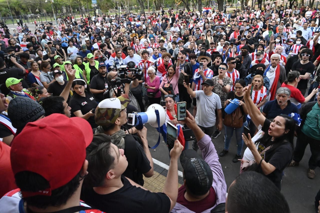 En la intersección de las calles 15 de Agosto y Presidente Franco, también se quedó grabado en video un tenso conflicto con la Policía Nacional. Los manifestantes reclamaron que no podían acceder a la zona del Congreso, donde estaba previsto el punto central de concentración.